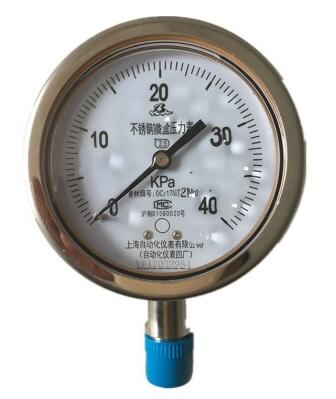 仪表由导压系统(包括接头、弹簧管、限流螺钉等)、齿轮传动机构、示数装置(指针与度盘)和外壳(包括表壳、表盖、表玻璃等)所组成。外壳为气密型结构,能有效地保护内部机件免受环境影响和污秽侵入。对于在外壳内充液(一般为硅油或甘油)的仪表,能够抗工作环境振动较剧和减少介质压力的脉动影响。